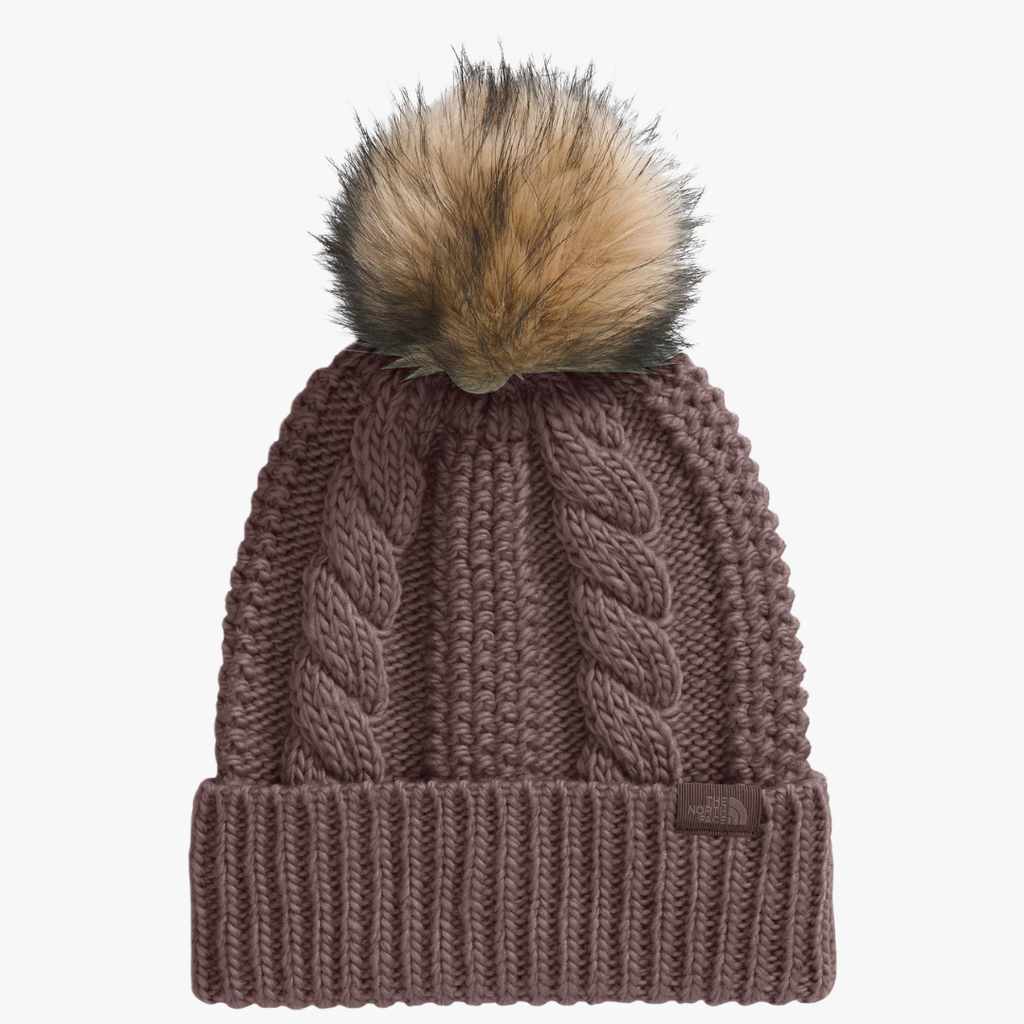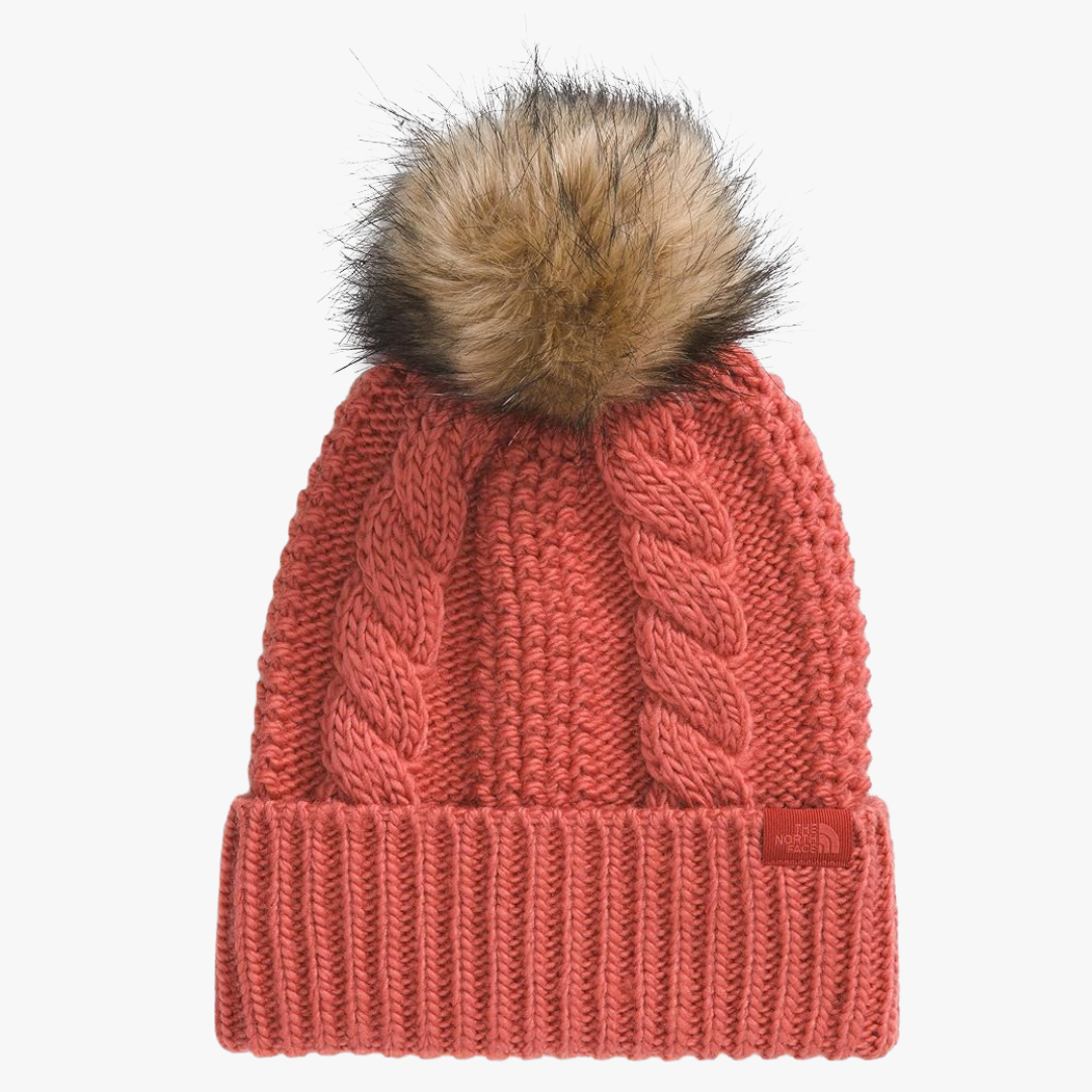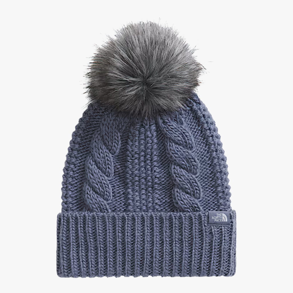 The North Face's popular women’s beanie features body fabric made with recycled polyester yarn and an oversize faux-fur pom and modern cabling.