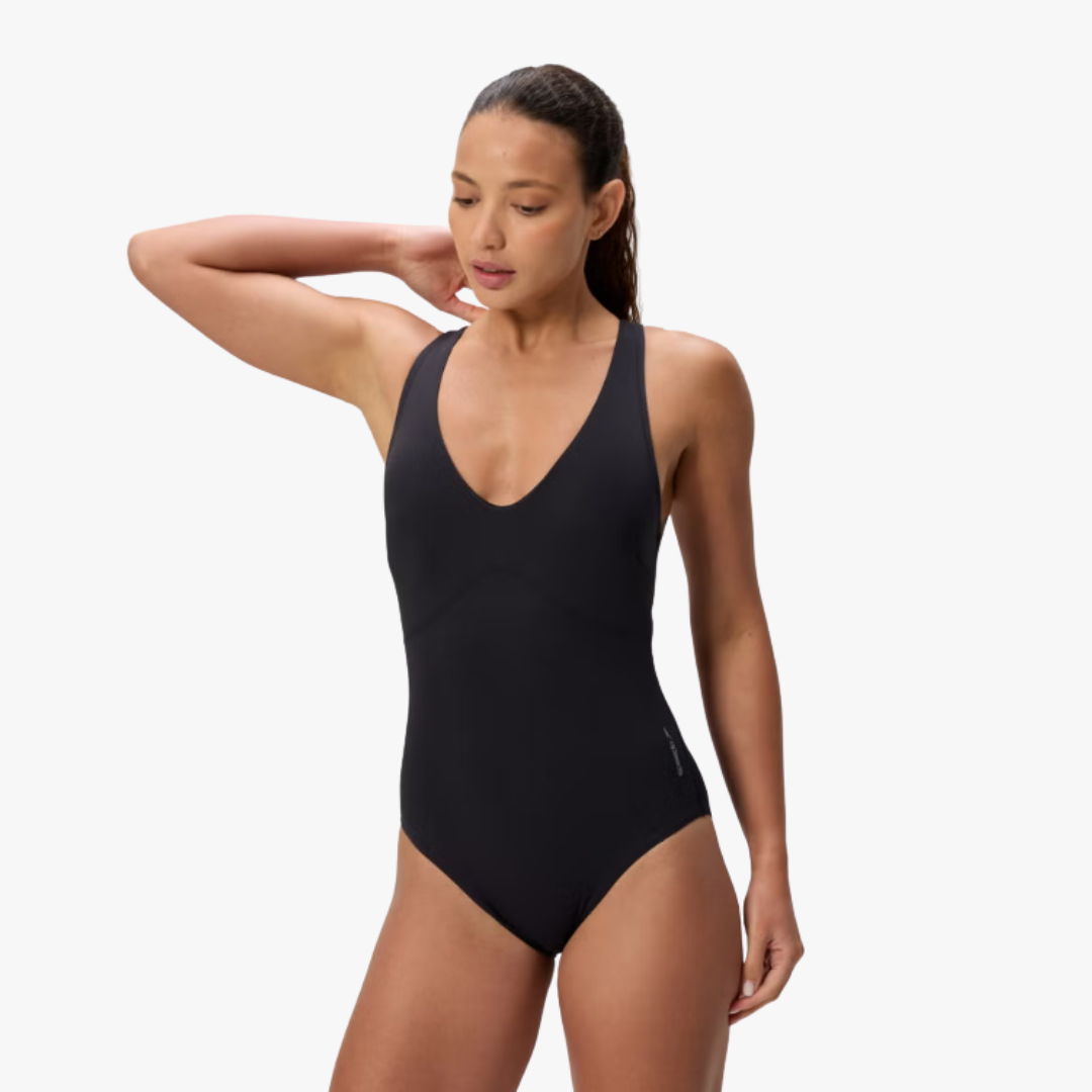 Made for workouts and active swims, our new Butterfly Back shaping swimsuit delivers the perfect blend of comfort and support. Sculpture fabric with LYCRA® XTRA LIFE™ gently contours the body for a flattering fit, while a powermesh liner shapes and smooths. Resistant to chlorine and pilling for lasting performance, it features four-way stretch and a 360-degree comfort under bust elastic for medium bust support. Featuring adjustable straps, removable soft cups, and our Mid coverage. Body made of 73% nylon, 27% LYCRA® XTRA LIFE™.